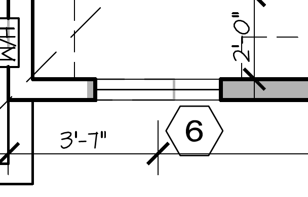 Example: On a retail plan, a storefront window is marked with a numbered hexagon, directing you to refer to the correlating window schedule.